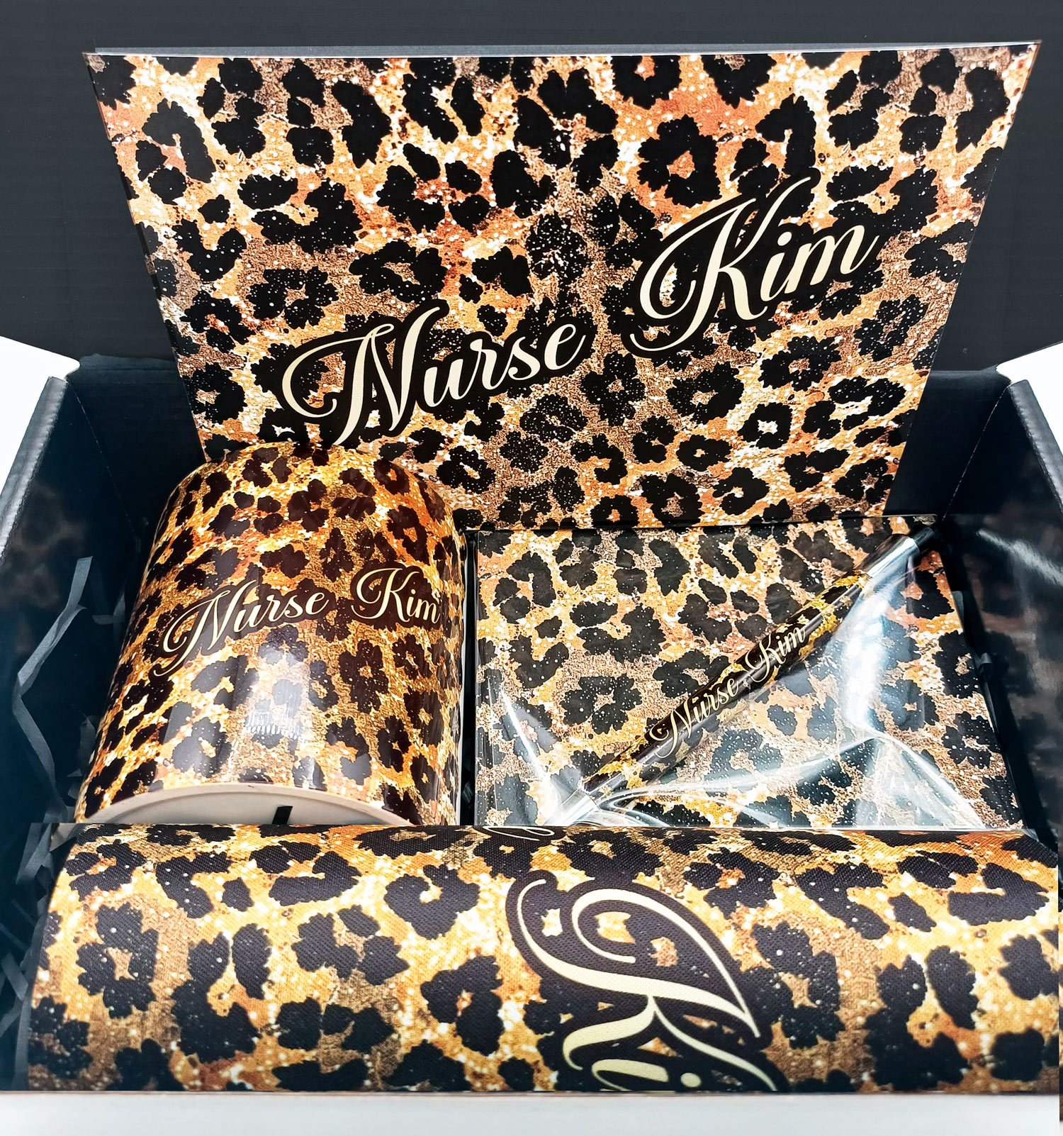Giftbox with personalized mug,pen,mousepad, and card in gold/black animal print